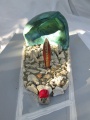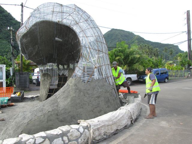 L'ensemble mesure 3,80 mètres de hauteur sur 4,50 mètres de long et 1,70 mètre de profondeur. Il a nécessité un mois et demi de labeur. La vague est verte, "car en réalité l'eau n'est pas bleue mais bien verte. Le bleu, c'est la couleur du ciel qui se reflète". Le support consiste en un platier de corail récupéré à Rangiroa. "Attention", prévient le sculpteur, "nous ne sommes pas allés casser du corail vivant, nous avons pris du corail blanchi. Cela nous a pris une semaine". Le platier renseigne le novice sur les dangers du surf "sur ce qu'il y a en bas de la vague et qui déchire".