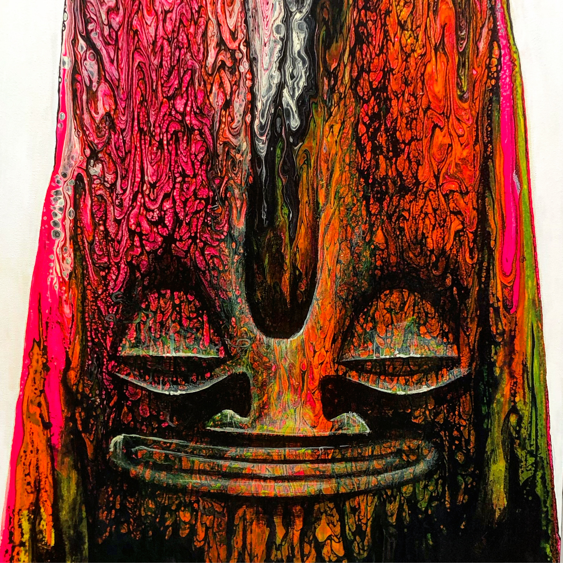 Ses inspirations sont la culture polynésienne, le surf art, le graffiti, l’art abstrait (lire aussi l’encadré). Ses techniques sont le pouring, le pochoir, les coulures… HTJ a utilisé des bombes, des pinceaux, des contenants de volumes variés pour déposer de la couleur sur ses toiles. Il a empilé les couches. Il a étalé, vaporisé, aspergé, versé. Il a laissé sécher, puis recommencé. Il a répété l’opération, encore et encore. Parfois, il est allé trop loin. “Pour cette exposition, j’ai fait énormément de toiles, mais peu sont restées au final.” Peu ont survécu. La plupart a été détruite ou recomposée.