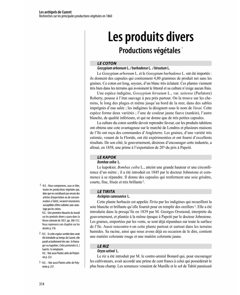 À propos des variétés de taro, il écrit : “(…), les indigènes préfèrent celles qui ont les pétioles ou la chair du rhizome colorés. Ils ont une prédilection toute particulière pour le taro à chaire noire qui, après cuisson, est mou, gélatineux et piquant au goût. Les Européens au contraire préfèrent le taro blanc ou légèrement violacé qui, après cuisson, est ferme, farineux et d’un goût agréable (…)”.