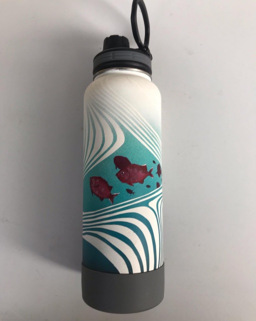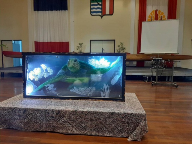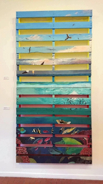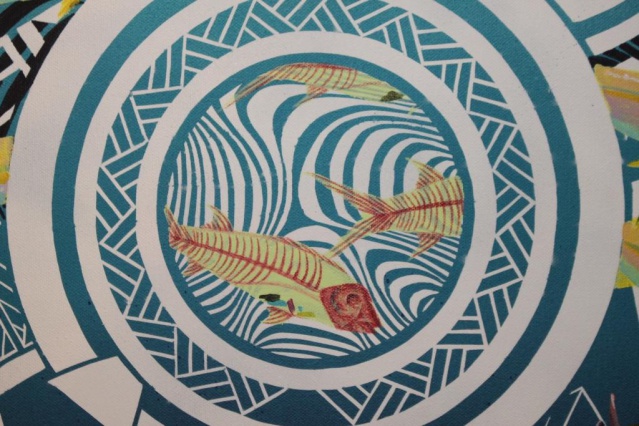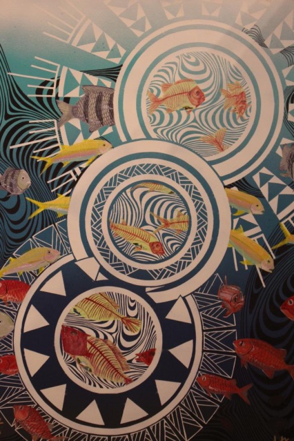 À côté de la langouste, des poisons évoluent sur une toile où sont dessinés trois cercles. "J’ai voulu inscrire cette œuvre dans la culture polynésienne, j’ai réalisé des motifs de l’archipel de la société." Les cercles sont des lentilles pour voir à l’intérieur des poissons.