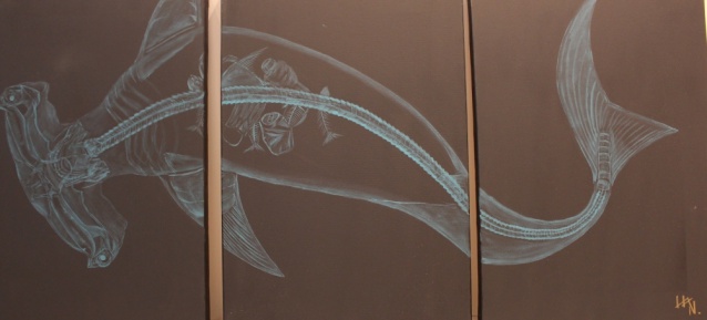 Enfin, un triptyque complète les œuvres. Un requin marteau, ou mokarran, se découpe finement du fond noir. "Les requins ont la réputation d’être des poubelles de mer", rappelle Hanaiti Mariassouce.