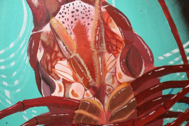 "Je présente des œuvres engagées pour dénoncer la pollution marine." Devant elle, posé sur le sol, se trouve tout d’abord une "langouste humaine". C’est le nom qu’elle a donné à son tableau qui, de loin, représente en effet le crustacé.