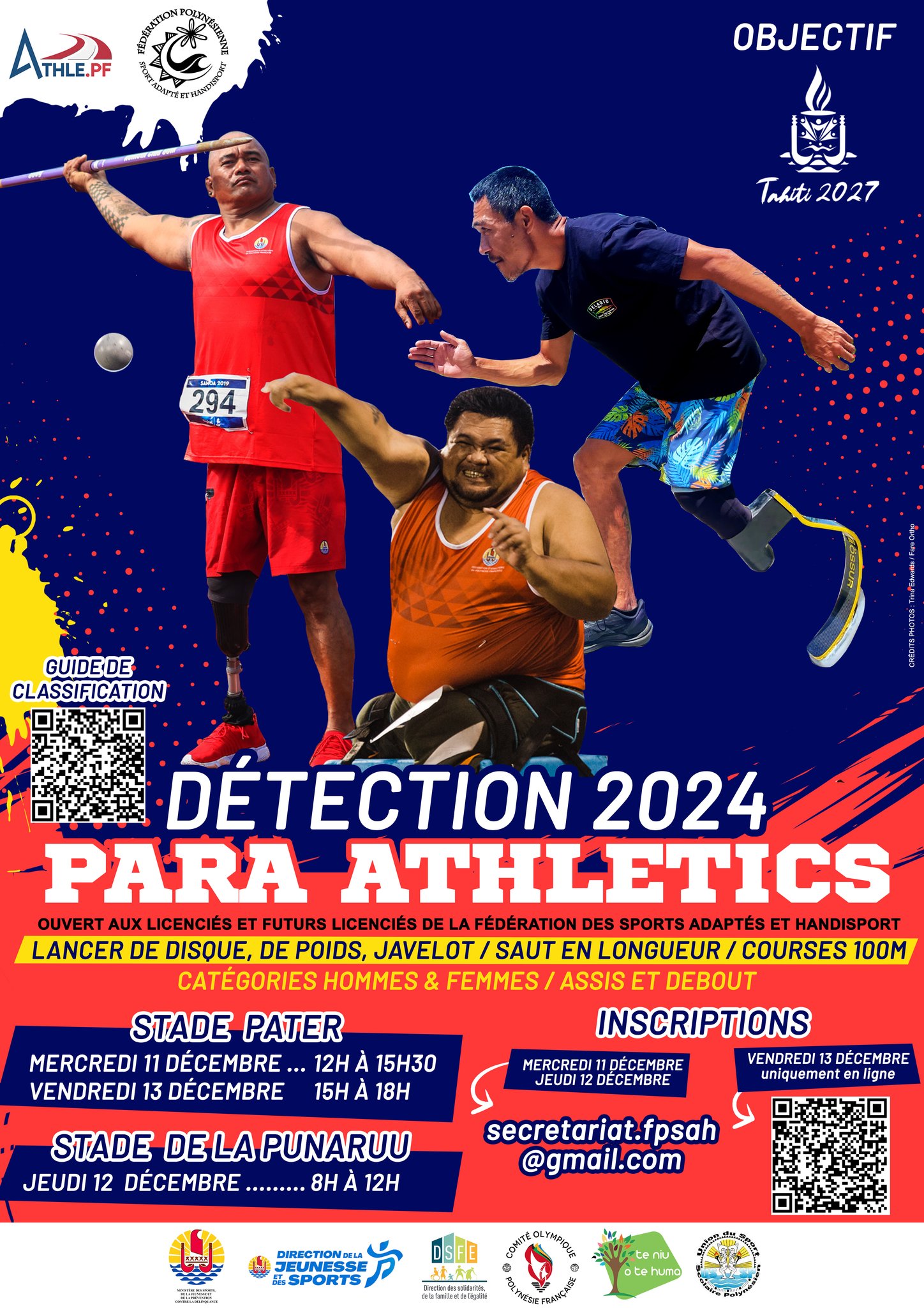Tahiti, le 9 décembre 2024 - Mercredi, jeudi et vendredi, la Fédération polynésienne des sports adaptés et handisport (FPSAH), en collaboration avec la Fédération d'athlétisme de Polynésie française (FAPF), organise des détections pour découvrir les talents de demain. Débutants ou pratiquants, tout le monde peut tenter sa chance et vivre une véritable aventure sportive et humaine.