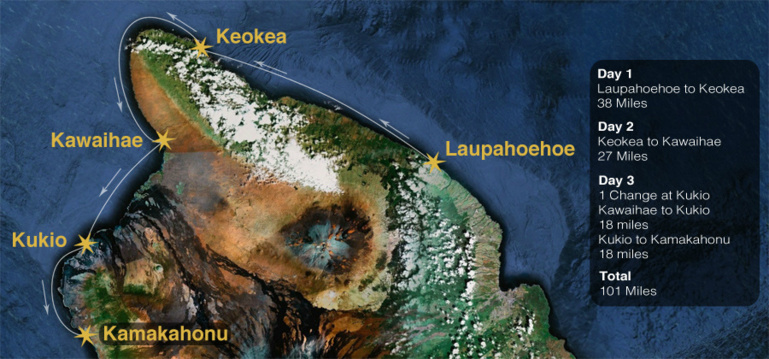 La Olamau est la course de pirogue la plus difficile au monde. En haute mer elle part de la péninsule de Laupahoehoe pour terminer à Kamakahonu avec deux étapes intermédiaires à Keokea et Kawaihae harbor. La distance totale de la course est de 101 miles soit un peu plus de 160 kilomètres.