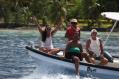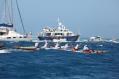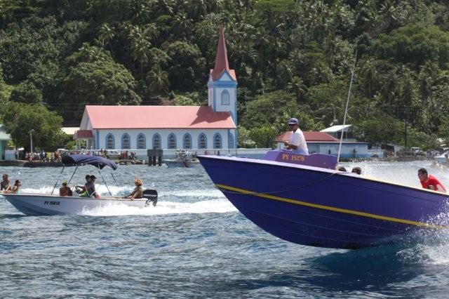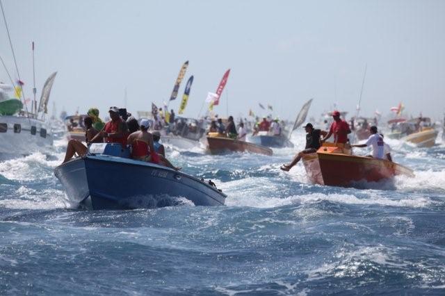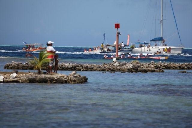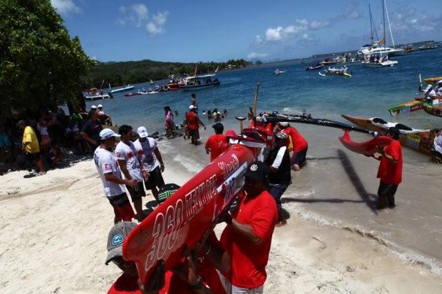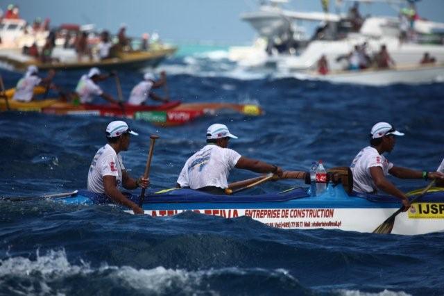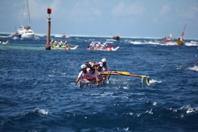 Taha’a le 8 novembre 2012. La deuxième étape de la course annuelle Hawaiki Nui Va’a s’est déroulée dans le lagon qui entoure Raiatea et Taha’a. C’est la plus courte des trois étapes (26 Km) mais toute en puissance puisque la houle à l’intérieur du lagon est inexistante, la course doit se gagner à la force des bras.
