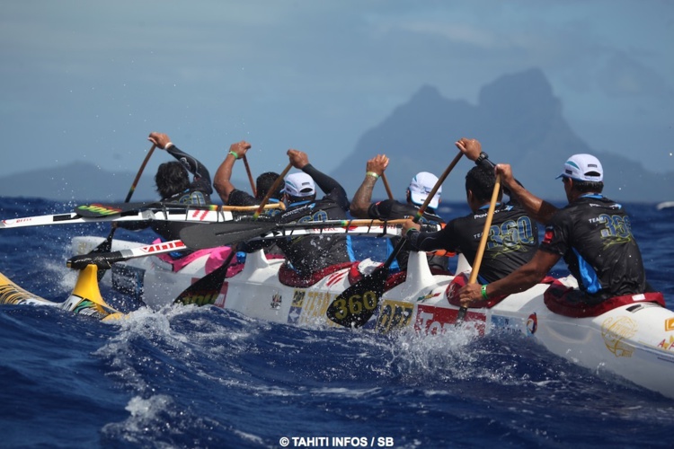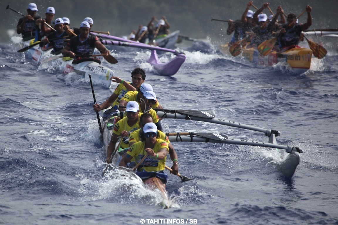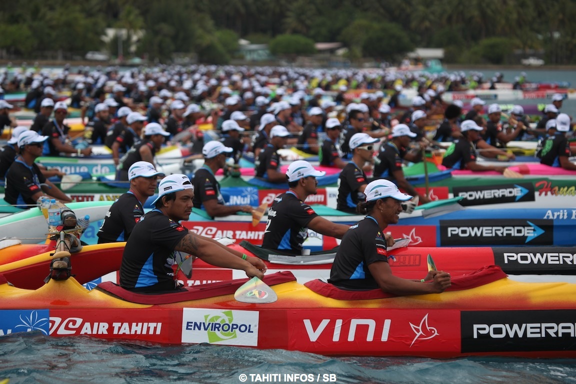 Le départ a été donné vers 7H30, il a été laborieux. Les pirogues étaient alignées mais la sirène n'a pas retenti, puis les pirogues ont avancé et il leur a été demandé de se remettre sur la ligne de départ. Les dernières pirogues terminaient de se repositionner quand le départ a finalement été donné. La tâche est souvent difficile, l'alignement de 80 pirogues peut parfois être compliqué par le courant, comme à Huahine par exemple.