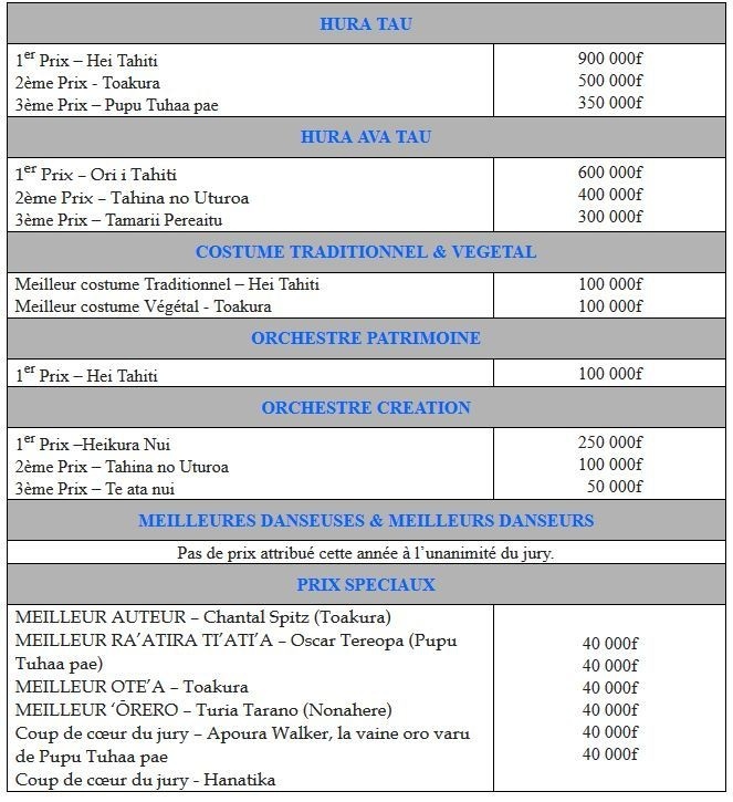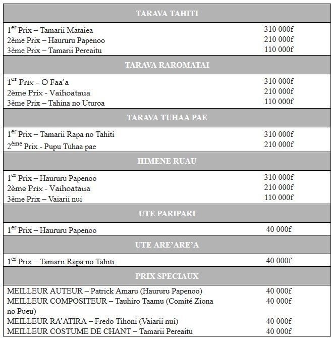 Sous l’égide du Ministère de la Culture et dans le cadre des festivités du Heiva i Tahiti, Te Fare Tauhiti Nui – Maison de la Culture a le plaisir de vous transmettre les résultats du A l’issue de 6 soirées de concours, le jury présidé par Mme Manouche Lehartel et composé de Tonio Iro, Victor Teriitahi, Marguerite Lai, Jean Pierre Cheung Sen, Robert Peretia, Myrna Tuporo, Roméo Tauraa et Jacky Bryant a attribué les prix suivants :