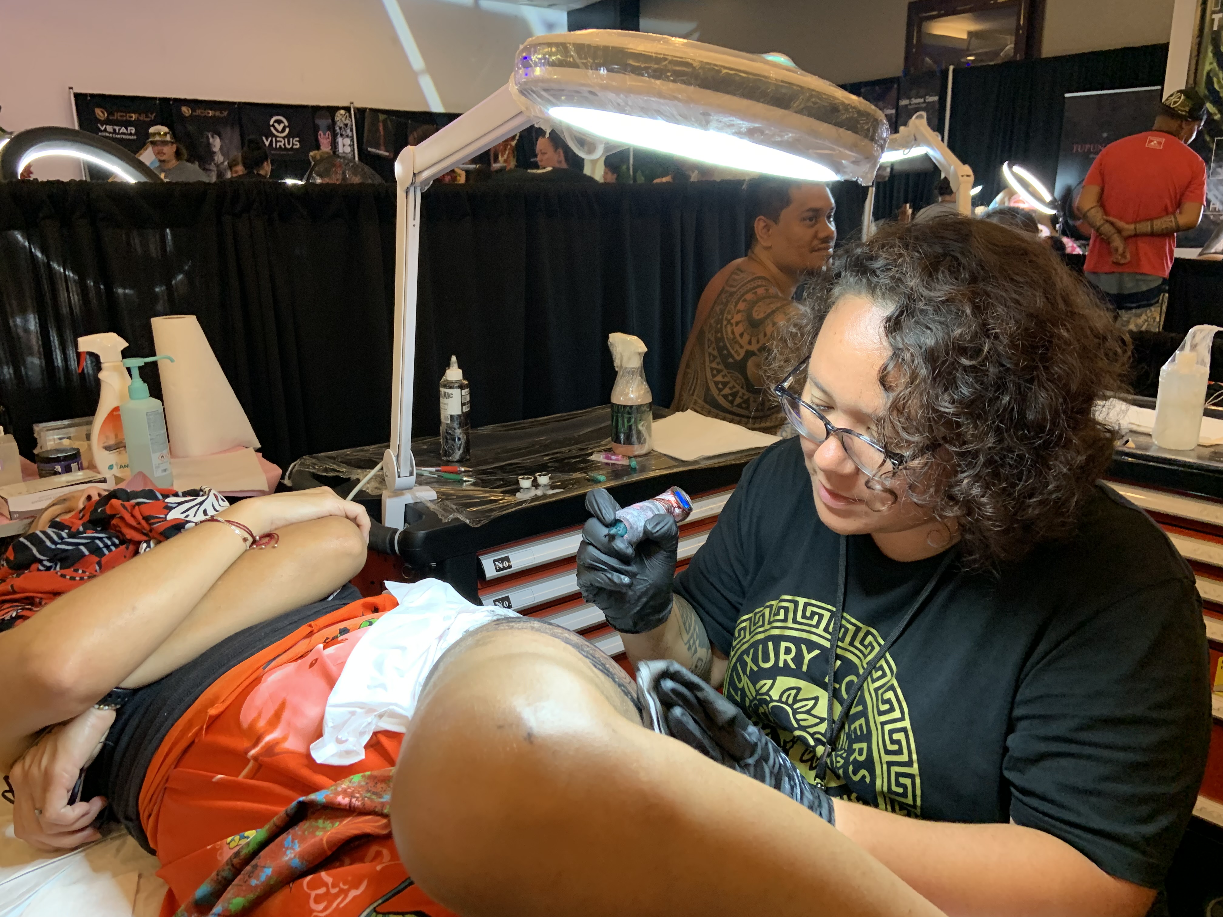 Enfin, j’ai remarqué qu’il y avait peu de femmes tatoueuses pendant cette convention, et tu es la seule Polynésienne. Penses-tu que le tatouage reste un domaine dominé par les hommes, ou y a-t-il d’autres raisons à ce manque de représentation féminine ici ?