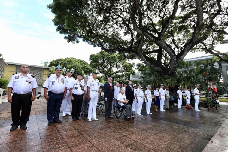 Tahiti, le 23 avril 2022 - Réserve électorale oblige, c'est le directeur de cabinet du haut-commissaire, Cédric Bouet, qui a présidé vendredi matin la cérémonie organisée à l'occasion de la journée nationale du souvenir des victimes et des héros de la déportation, au monument aux morts de Papeete, Avenue Pouvana'a a Oopa. Une journée qui perpétue et honore la mémoire de toutes les victimes et héros de la déportation.