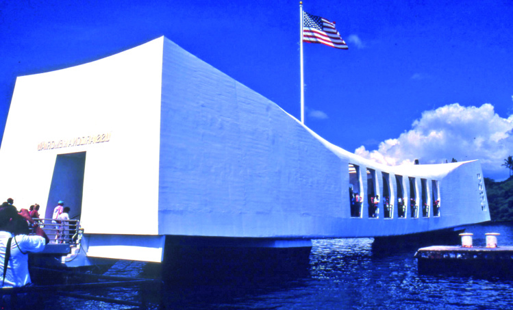 Le principal bâtiment, sur l’eau, est d’une extrême sobriété. Blanc immaculé, il semble flotter au-dessus du cuirassier “USS Arizona” d’où s’échappent encore des gouttes d’huile formant de petites flaques iridescentes à la surface de la rade.