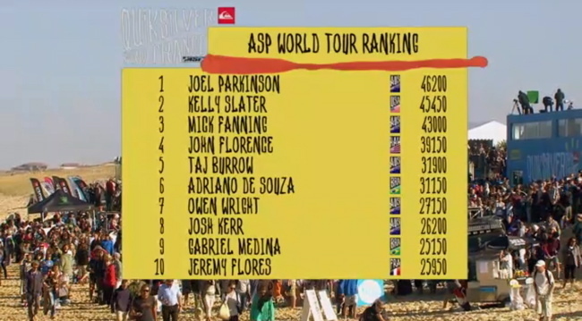 Joel Parkinson l’Australien prend la tête du championnat du monde. Kelly Slater l’américain est deuxième, Mick Fanning australien également est troisième, le suspense reste entier. Il reste l’étape du Portugal, une étape en Californie puis celle de Hawaii. Pour Joel les deux prochaines étapes risquent d’être décisives car à Pipeline John John Florence ou Kelly Slater sont favoris.