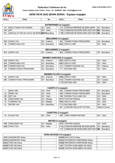 Tahiti, le 24 octobre 2022 – La 29e édition de la Hawaiki nui va’a, attendue depuis deux ans, est prévue du 26 au 28 octobre prochain avec son parcours traditionnel dans les îles Sous-le-Vent. La course Aere ra’i e a été ajoutée au programme, le 29 octobre, avec de nouvelles catégories. Au total, 171 équipes sont prévues pour ces quatre jours d’événements sportifs.