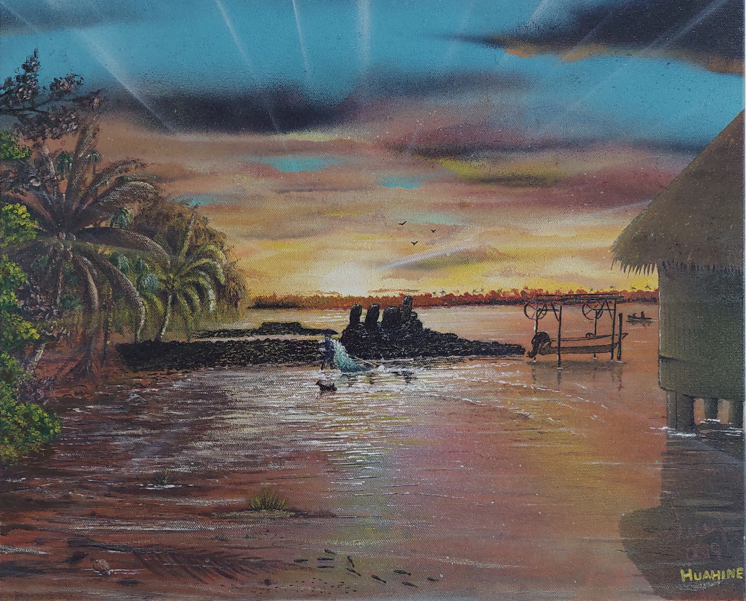 Ils sont réunis en un “atelier”. L’Atelier de Huahine est le nom utilisé pour définir le groupe d’artistes peintres de l’île des femmes qui vient exposer une fois l’an à Tahiti depuis plusieurs années. “Nos expositions collectives ont démarré en 2018, période à laquelle nous avons fondé l’Atelier de Huahine autour du peintre Raymond Vigor que nous tenons à remercier”, précisent les artistes. Jen Kuperman donne des détails : “En tant que groupe, nous donnons notre vision des différentes facettes de l’île et nos ressentis de la vie à Huahine. Nous voulons aussi inviter les jeunes à nous suivre, leur dire qu’ils peuvent se joindre à nous. À chaque fois, l’exposition est un défi personnel pour chacun d’entre nous, mais nous relevons ce défi.” Jen Kupermann est australienne de naissance, elle est une artiste autodidacte. Elle aime peindre en studio comme en extérieur. “En plein air”, comme elle aime le souligner, pour louer l’île de Huahine et ses éléments terre et mer.
