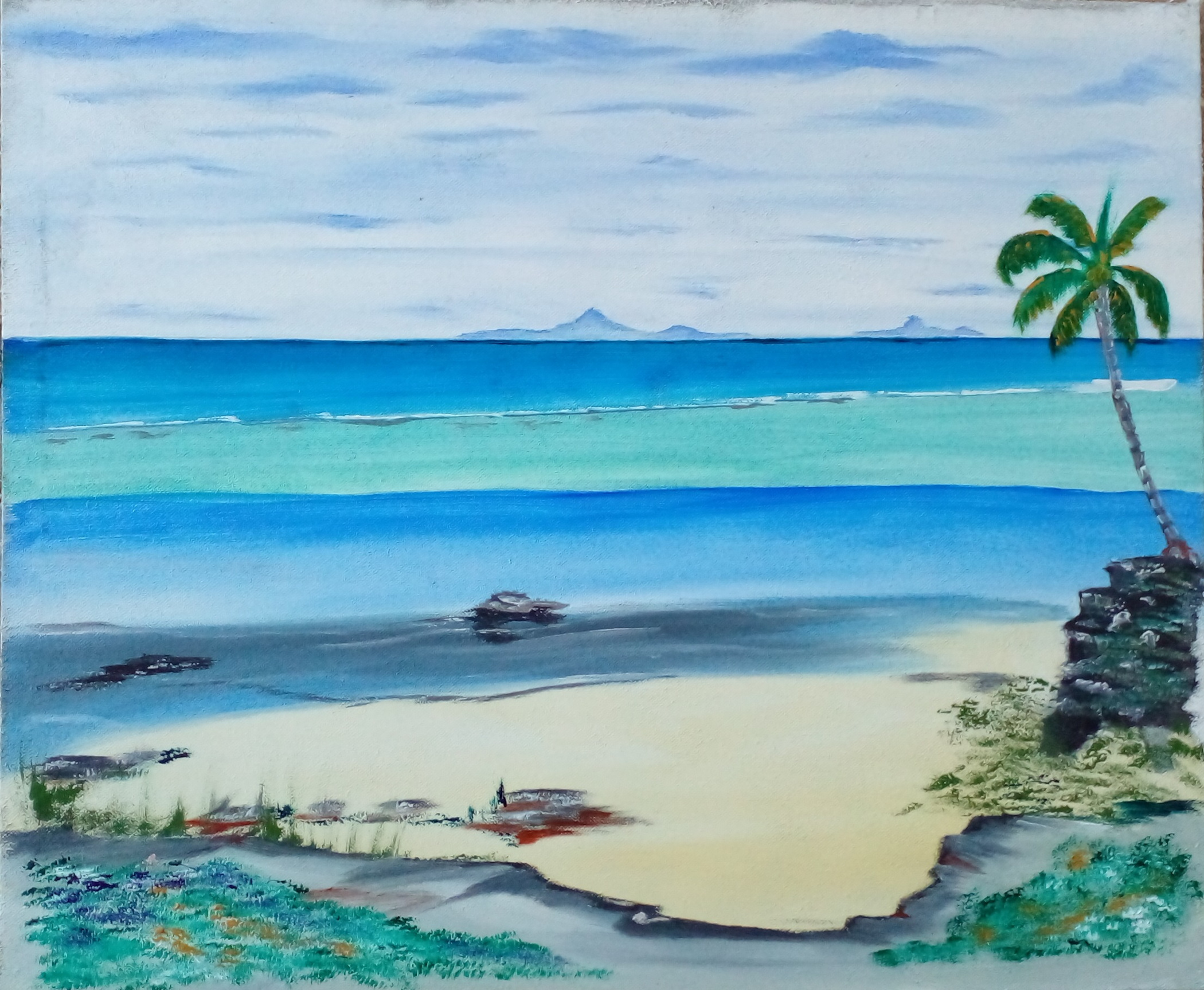 La plupart des artistes de l’atelier travaillent en solo à la maison, “mais il arrive qu’on se retrouve pour un atelier, en pleine nature, comme récemment à Uramoe, au motu de Maeva”. Plusieurs tableaux qui seront exposés ont d’ailleurs démarré sur cette plage qui donne une vue sur Mou’a Tapu, Motu Mahare, la baie de Faie, le mont Pohue Rahi à Tefarerii…