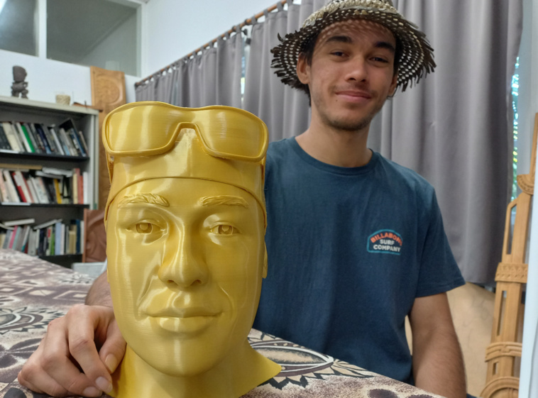 “J’ai choisi pour définition du terme ‘huri’ l’inversion et la transformation”, explique Tuarii Vecker-Sue. Il est en 2e année de BPMA (Brevet polynésien des métiers d’art). Il a réalisé plusieurs bustes, quatre en acide polylactique (PLA ou plastique biodégradable utilisé en impression 3 D) et un en acajou. Ces pièces font sens ensemble. “Je propose une inversion dans le contexte, dans l’esthétique et dans le matériel”, résume-t-il. Ses quatre bustes en PLA représentent des amis, “des gens du quotidien, jeunes, alors que souvent les bustes représentent des personnes célèbres, et plutôt d’un certain âge”. L’un d’eux porte casquette et lunettes. Les couleurs sont vives.