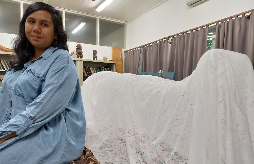 Tiffany Vahinetua est étudiante en 1er année de DN Made, le diplôme national des métiers d’art et du design. Son travail est présenté dans le cadre de la “mise en œuvre de projet” de son cursus. Elle doit, non seulement créer, mais aussi être capable d’expliciter le processus créatif et toute la réflexion que cela a impliqué. Elle présente un voilage de dentelle qu’elle a durci avec de la résine et qui représente un corps gisant. Pour obtenir la forme désirée elle a sculpté au préalable un corps dans de la mousse expansive. “J’ai voulu parler des victimes du Covid ; de cette période violente que nous avons vécue et qui a été comme une rupture”, rapporte Tiffany Vahinetua. Elle interroge au passage la société et ses traditions, les veillées et hommages aux défunts dont certaines familles ont été privées pendant l’épidémie. “Quand quelqu’un part, c’est l’occasion de nous retrouver, de partager. On chante, on rit, on pleure, on mange également.” Toute l’importance de cette tradition a été révélée par son absence, mais quelle est sa place ? Quel impact pour celles et ceux qui en ont été privés ?