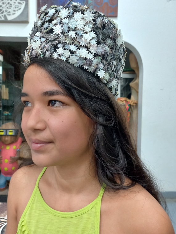 Pour Manea Macé, le terme “huri” signifie également “inverser, retourner, changer”. Elle a porté son regard dans les étoiles et conçu un dôme, une couronne et un serre-tête. “L’inversion tient au fait que les marins, pour se déplacer, utilisaient notamment les étoiles. Ils regardaient en haut pour se déplacer en bas.” Sa couronne est parée d’une multitude d’étoiles de nacres “pour donner un effet de saturation, comme si toutes les étoiles étaient réunies sur une même tête”.