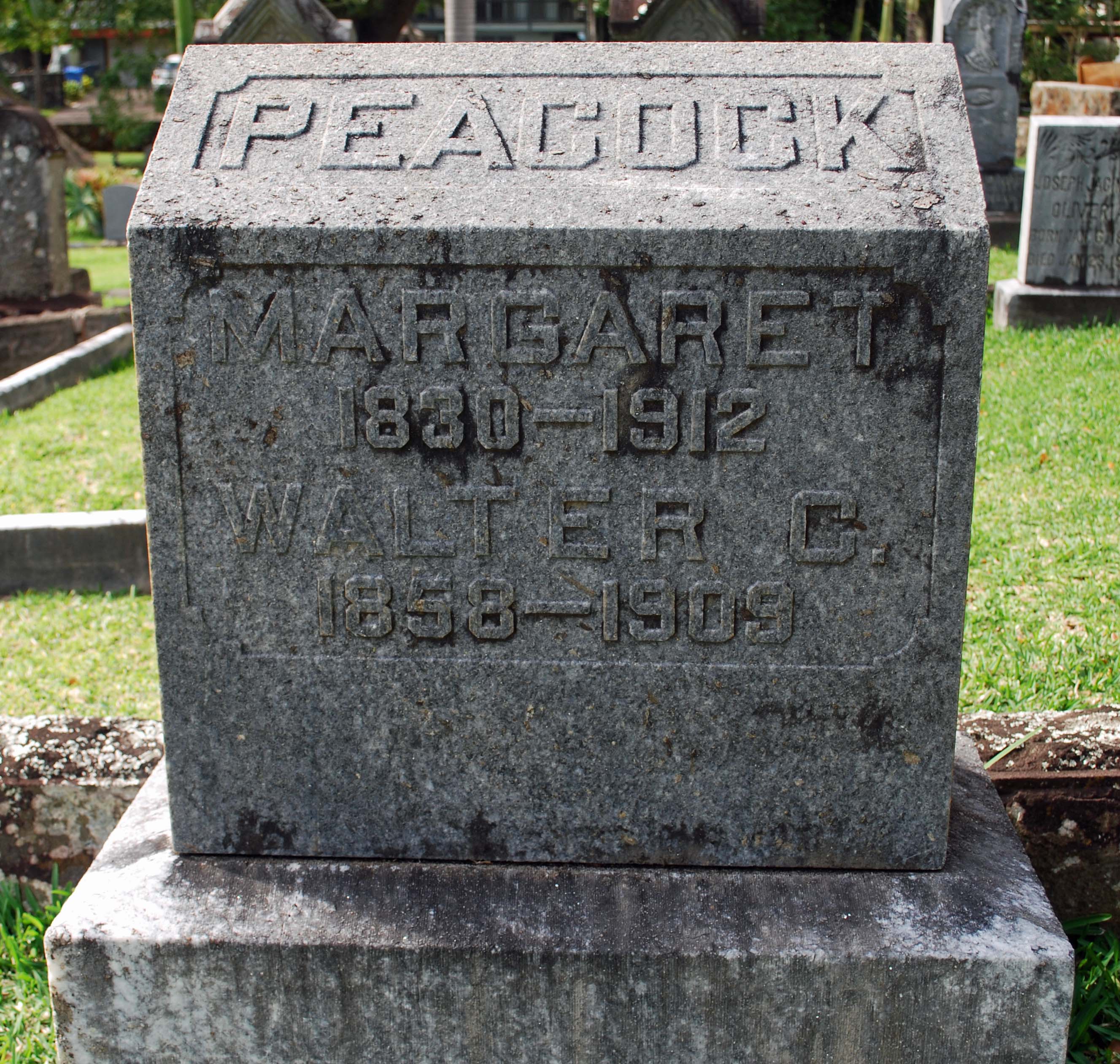 Walter Chamberlain Peacock repose au cimetière d’Oahu, dans une section baptisée “Peacock Plot”. Il y repose aux côtés de sa mère, décédée trois ans plus tard à quatre-vingt deux ans. Margaret et Walter ont une pierre tombale commune. Quant à son épouse, elle regagna après la mort de son mari sa Nouvelle-Zélande natale.
