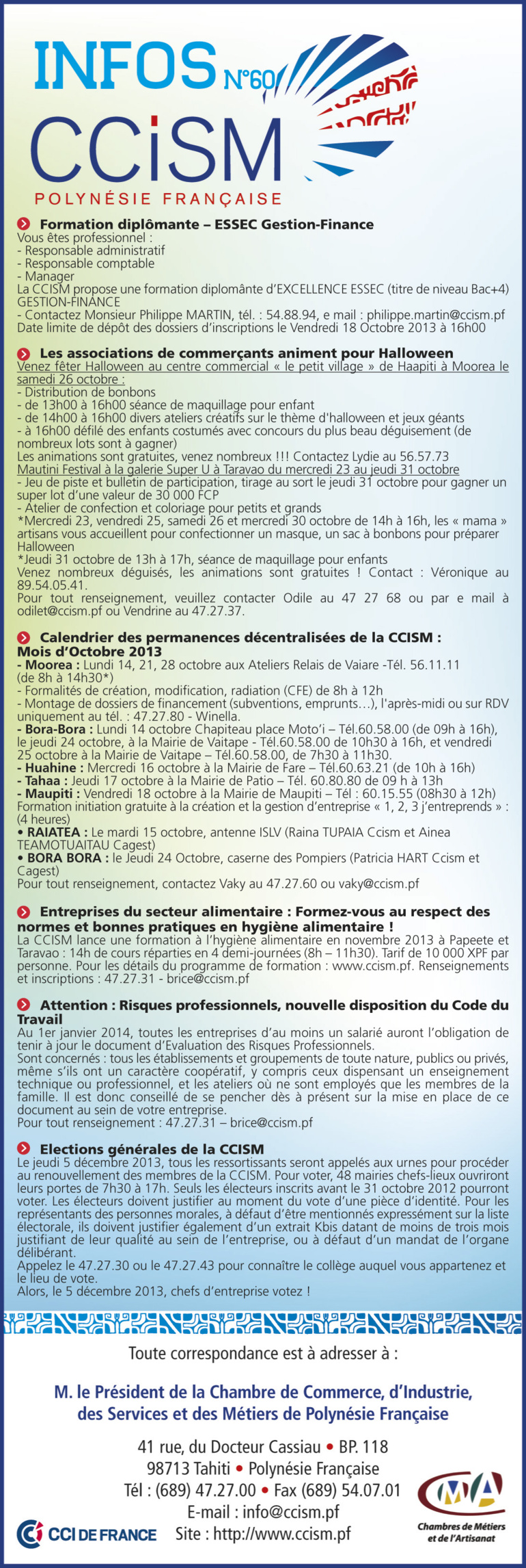 - Elections générales : le jeudi 5 décembre 2013 pour le renouvellement des élus de la CCISM