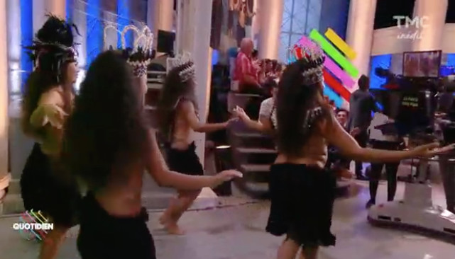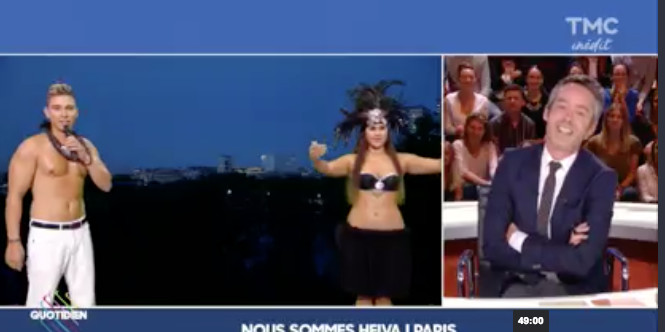 PAPEETE, le 12 septembre- L'émission Quotidien de Yann Barthès avait décidément des airs très polynésiens ce mardi 12 septembre. Après avoir invité Vincent Cassel pour la présentation du film Gauguin et avoir échangé quelques mots en tahitien avec lui, l'animateur a invité la troupe du Heiva i Paris et Ken Cartler à présenter le bulletin météo...en tahitien! ( à retrouver à la minute 48' sur la vidéo) Un petit clin d'oeil très sympathique pour le fenua! Maururu'u