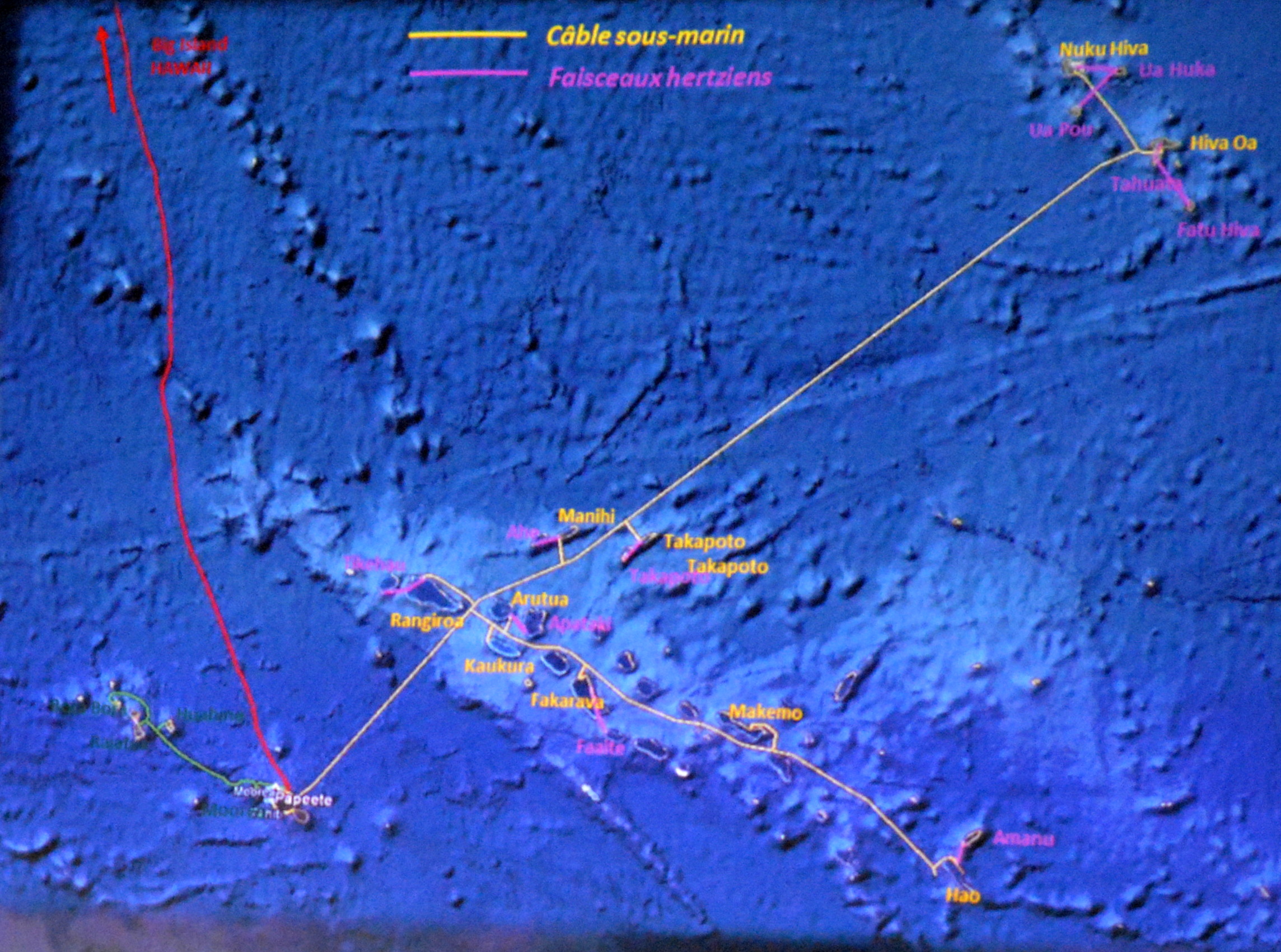 Un raccordement internet par câbles sous-marins depuis Tahiti est envisagé avec les îles de Nuku Hiva et Hiva Oa, dans l’archipel des Marquises. Dans l’état actuel du projet, ce câble desservira aux Tuamotu les atolls de Rangiroa, Manihi, Takaroa, Arutua, Kaukura, Fakarava, Makemo et Hao.