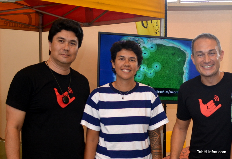 Marc Collins et Thierry Lehartel, les deux fondateurs de Smart Tahiti Networks, lors de la présentation de la toute première initiative de l'opérateur : l'application Firechat. Entre eux se trouve Tauahere Coupel, la première technicienne de STN.