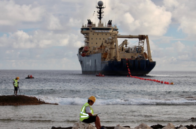 FAKARAVA, le 16 août 2018- Le câblier l'Île de Batz est arrivé à Fakarava pour commencer la pose du câble sous-marin qui devrait permettre de procurer l'internet haut-débit dans 20 îles des Tuamotu et des Marquises avant la fin de l'année.
