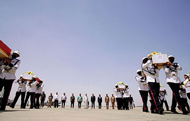 Transporté par avion militaire depuis Erbil, capitale de la région autonome du Kurdistan dans le nord, les neuf cercueils recouverts du drapeau national et de gerbes de fleurs ont été accueillis sur le tarmac de l'aéroport de Bagdad par le Premier ministre Moustafa al-Kazimi.