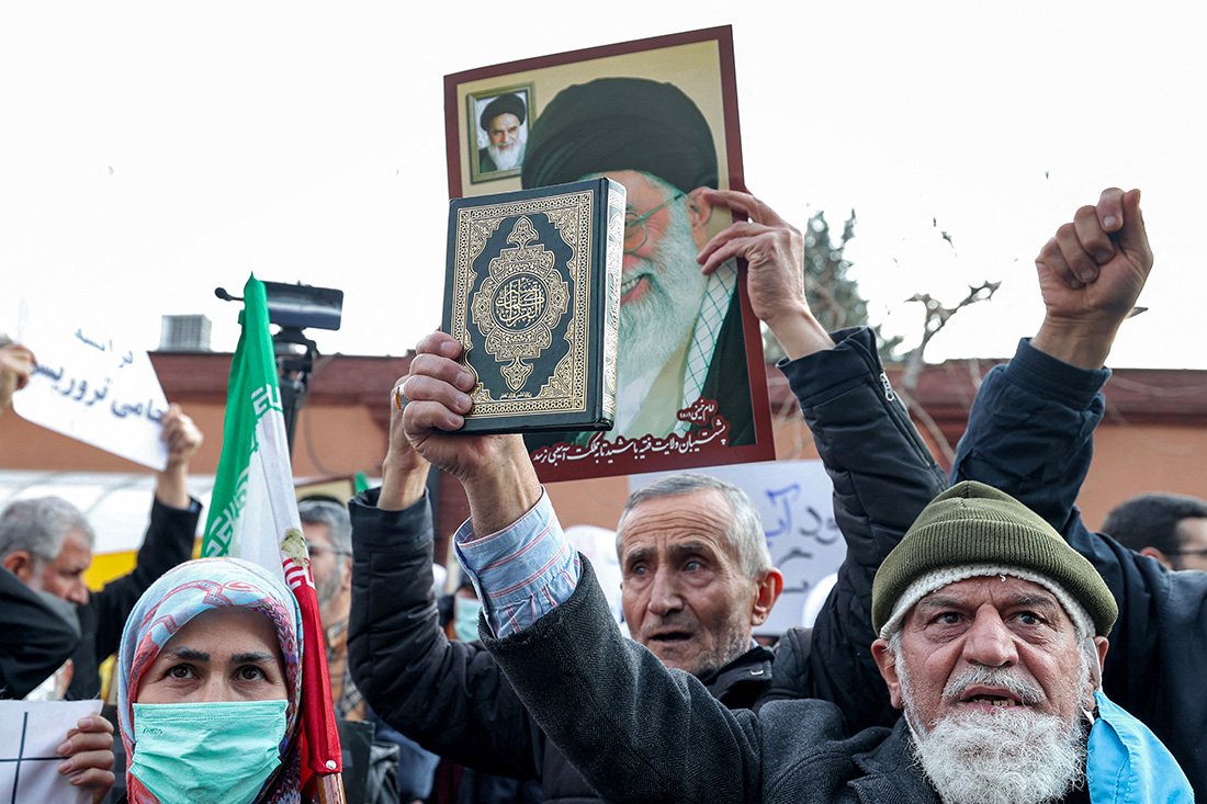 Téhéran, Iran | AFP | dimanche 08/01/2023 - Plusieurs dizaines d'Iraniens se sont rassemblés dimanche devant l'ambassade de France à Téhéran où ils ont brûlé des drapeaux français pour protester contre les caricatures du guide suprême de la République islamique publiées dans le journal satirique français Charlie Hebdo.