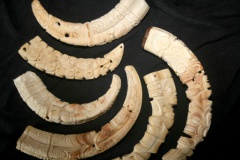 Parfois, mais rarement, les graveurs trouvaient un peu d’ivoire, provenant essentiellement de dents de cochons sauvages abattus à la chasse. Exceptionnellement, des dents de cachalot furent sculptées ici et là, mais la matière première demeurait très rare…
