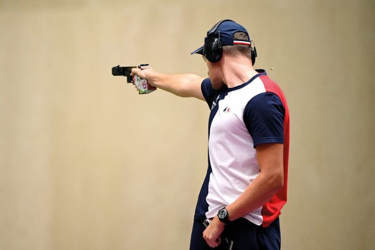 Tokyo - AFP - le 2 août 2021 - Cinq ans après sa deuxième place à Rio, Jean Quiquampoix, force tranquille du tir français, n'a pas frémi hier, en finale du pistolet à 25 m tir rapide des Jeux de Tokyo, dominant ses adversaires pour conquérir l'or olympique, dont il rêvait.