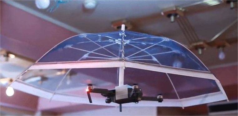 D'un diamètre de 1,5 mètre, le prototype de drone-parasol pèse 5 kilogrammes et n'a encore qu'une autonomie de 5 minutes avec une batterie chargée à bloc.