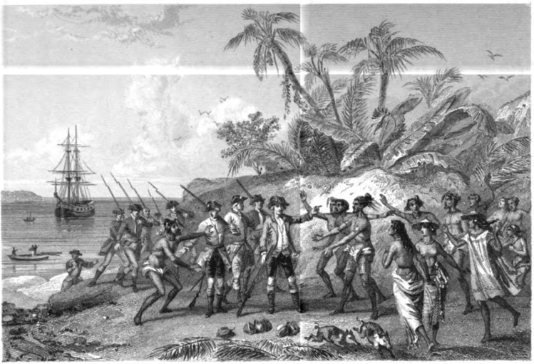 “La Boudeuse” et “l’Etoile” arrivent à Tahiti le 3 avril 1768, mais là, les choses vont de gâter. Vite ; très vite même. Le 4 avril, un Tahitien monte à bord, des pirogues entourent par dizaines les navires français, les premiers contacts sont chaleureux. Ravi de découvrir ces paysages somptueux, Commerson piaffe d’impatience. Il est pressé d’aller herboriser. Le 7 avril, il descend à terre, mais à peine a-t-il posé les pieds sur la plage qu’il se voit entouré d’une foule d’indigènes surexcités : pas par lui, mais par son valet, en qui les Tahitiens, plus futés que les marins français, ont immédiatement reconnu une femme, la première femme européenne qu’ils voient. Une minute plus tard, dans la cohue du débarquement, un Tahitien s’empare de Jeanne Baret et décide de filer avec elle pour “explorer” sa trouvaille ; ce n’est que grâce à l’intervention d’un officier armé que le hardi Roméo des îles est arrêté et que Jeanne est libérée. Tétanisée, elle doit regagner le bord où elle restera cantonnée le reste de l’escale, Commerson devant donc poursuivre sa tache seul et pour le moins dépité.