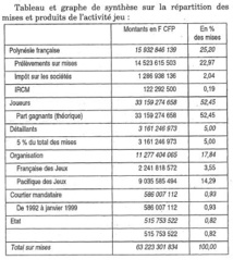 De 1991 à 2008, le chiffre d’affaires cumulé de la filiale polynésienne de la Française des jeux s’est établi à 68,4 milliard Fcfp. Les sommes redistribuées au budget de la Polynésie française ont été dans le même temps de 15,6 milliards Frcfp au titre du prélèvement sur les mises, pratiquement 7 milliards en TVA et 1,5 milliard d’impôt.