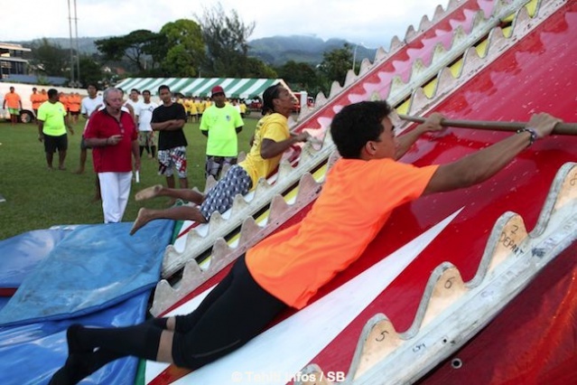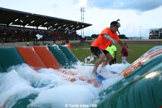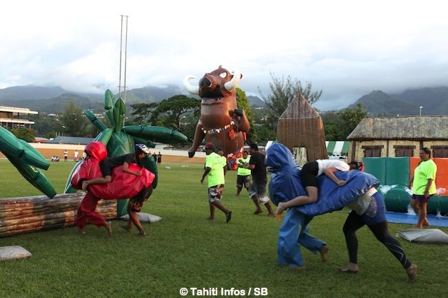 Différentes équipes ont été composées, avec un code couleur chacune, comprenant 15 joueurs et 5 pom pom girls. ‘Honu Raid’ qui consiste à voyager sur le dos d’une ‘tortue’ composée de deux personnes, ‘Saga Poerava’ qui consiste à évoluer avec des palmes sur une structure gonflable glissante pour aller chercher des ‘perles’ alors que des ‘requins’ sont cachés ou encore ‘Vahine mon amour’…Et bien d’autres jeux…