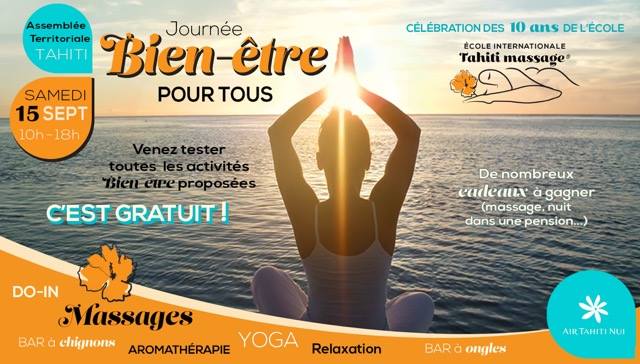 PAPEETE, le 7 septembre 2018 - L’école internationale Tahiti massage, pour fêter ses dix ans d’existence, organise une journée bien-être dans les jardins de l’Assemblée. Cet événement réunira près de vingt-cinq partenaires du secteur qui présenteront des activités, soins, produits et feront gagner des lots aux visiteurs.