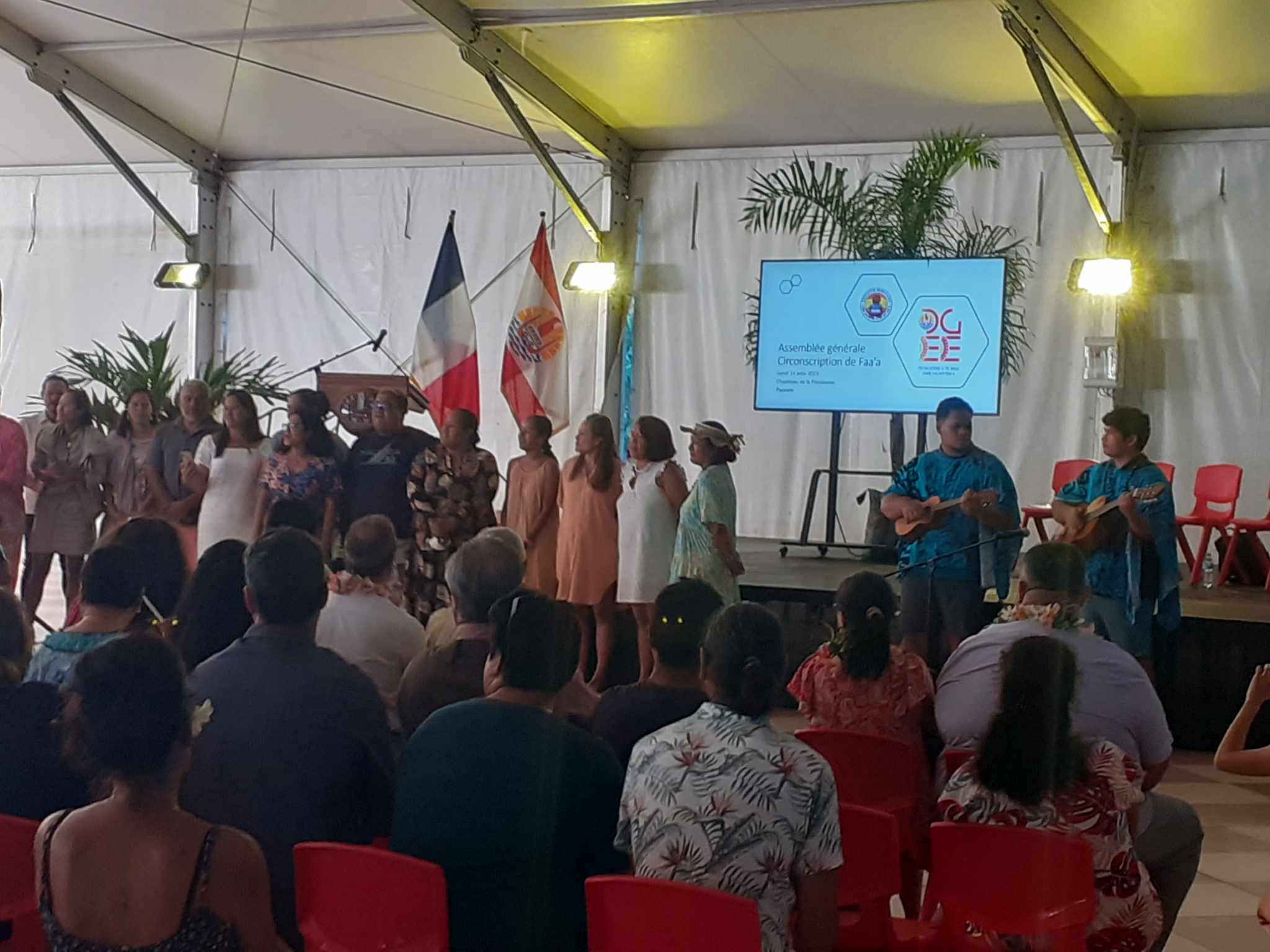 C'est une première. Les assemblées générales se font généralement dans les établissements scolaires, entre enseignants et personnels de l'Éducation. Ce lundi matin, c'est par circonscription que les acteurs de notre système éducatif se sont réunis. À la présidence, c'est celle de Faa'a qui était accueillie au son de Fa'ari'i Maina de Sissa Sue, un chant d'accueil interprété par plusieurs enseignants. Au pupitre, avant d'entamer les ateliers de cohésion mis en place, se sont succédé le président du Pays Moetai Brotherson, le ministre Ronny Teriipaia, le vice-recteur Thierry Terret, le directeur général de l’éducation et des enseignements (DGEE) Éric Tournier et, au titre de la commune de Faa'a, l'adjointe au maire Oscar Temaru, en charge des affaires scolaires, Victoire Laurent, et l'inspectrice générale de l'Éducation nationale de cette circonscription, Fatima Keskas.
