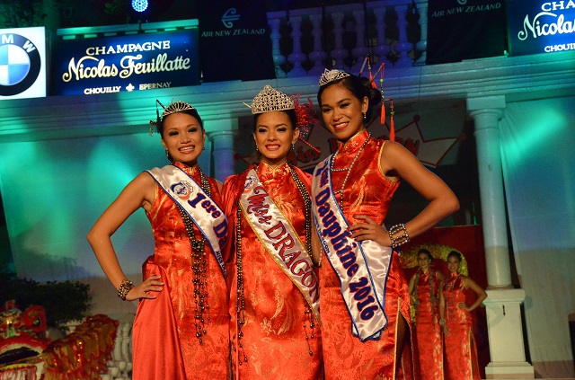 PAPEETE, le 19 juin 2016. Karen Vanquin a été élue Miss Dragon 2016 ce samedi soir. Evaina Ly est la première dauphine. et Reva Wong est la deuxième dauphine.