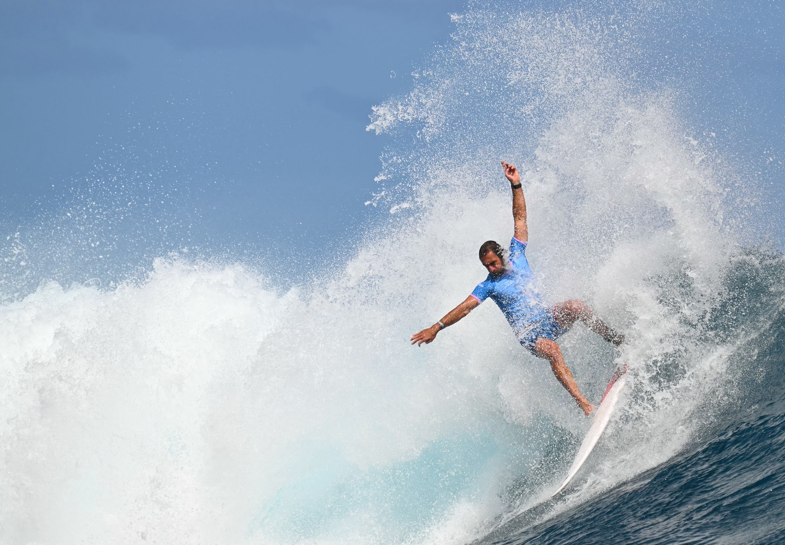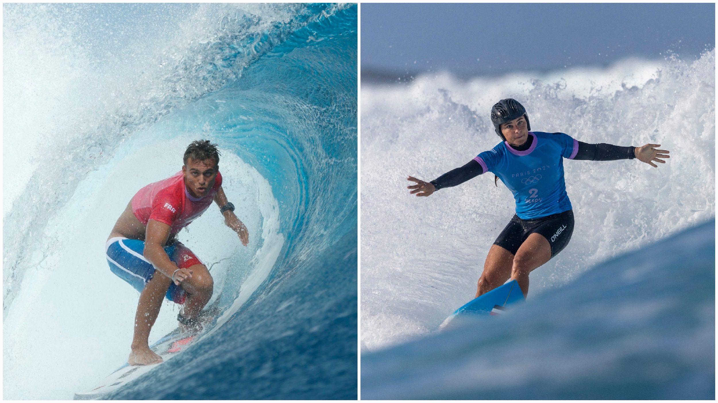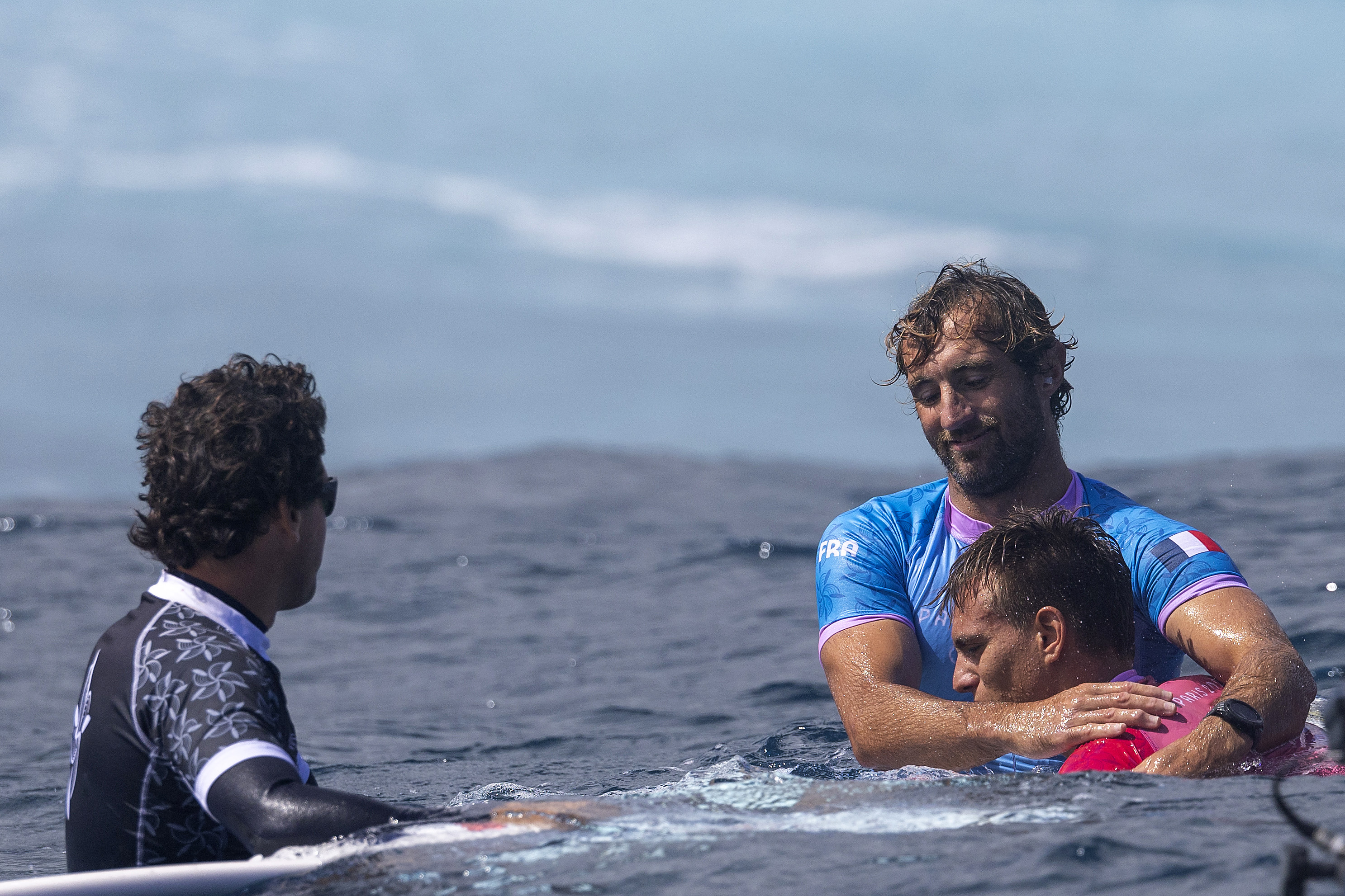Les deux surfeurs de l'équipe de France se sont qualifiés pour les demi-finales des Jeux olympiques, ce jeudi, à Teahupo'o (Crédit : AFP/Ben Thouard/Ed Sloane).
