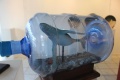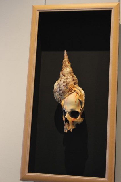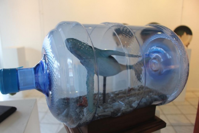 Le concept de Tahe est “de mixer les choses qui n’ont rien à faire ensemble à première vue” résume-t-il. Il n’est pas prolixe lorsqu’il est question de son travail. “Je laisse parler les œuvres”. Il a utilisé pour cette exposition (la 4e pour lui) des coquillages, de la résine, du sable, du bois, du plastique. Autant de matière ou objets “qui ont déjà une histoire”. Il a enfermé une baleine dans une bouteille, emballé une carapace de tortue dans un ruban, chapeauté une tête de mort avec un coquillage. Tahe est avare de mots mais jamais d’idées. Un bonheur pour le public en quête d’émotion et de sensation.
