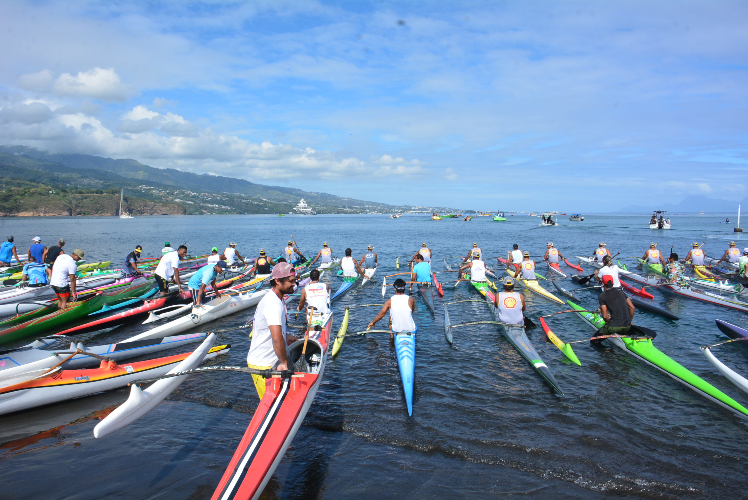 Toute ce beau monde a été lâché sur les coups de 9h30 dans des conditions météo très clémentes : un plan d'eau très calme entre Mahina et Taaone, un vent d'est peu présent le tout sous un ciel voilé. Dans ces conditions le meilleur départ a été pour Kevin Céran-Jérusalémy qui s'est rapidement emparé de la tête de la course. Derrière le natif de Huahine, Manutea Millon, Hotuiterai Poroi et les deux Shelliens, Iorama Teahu et Charles Teinauri, étaient les plus proches poursuivants.