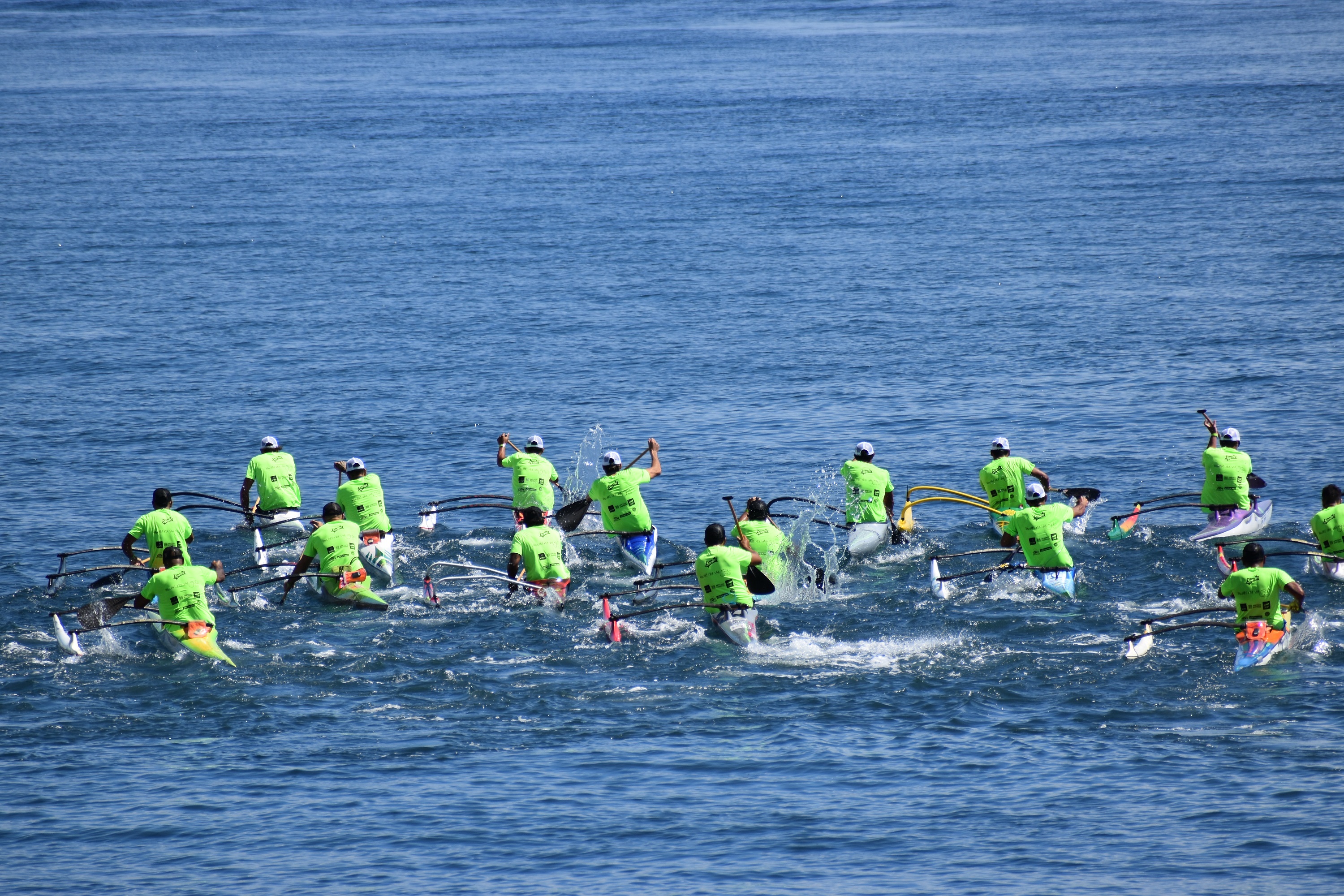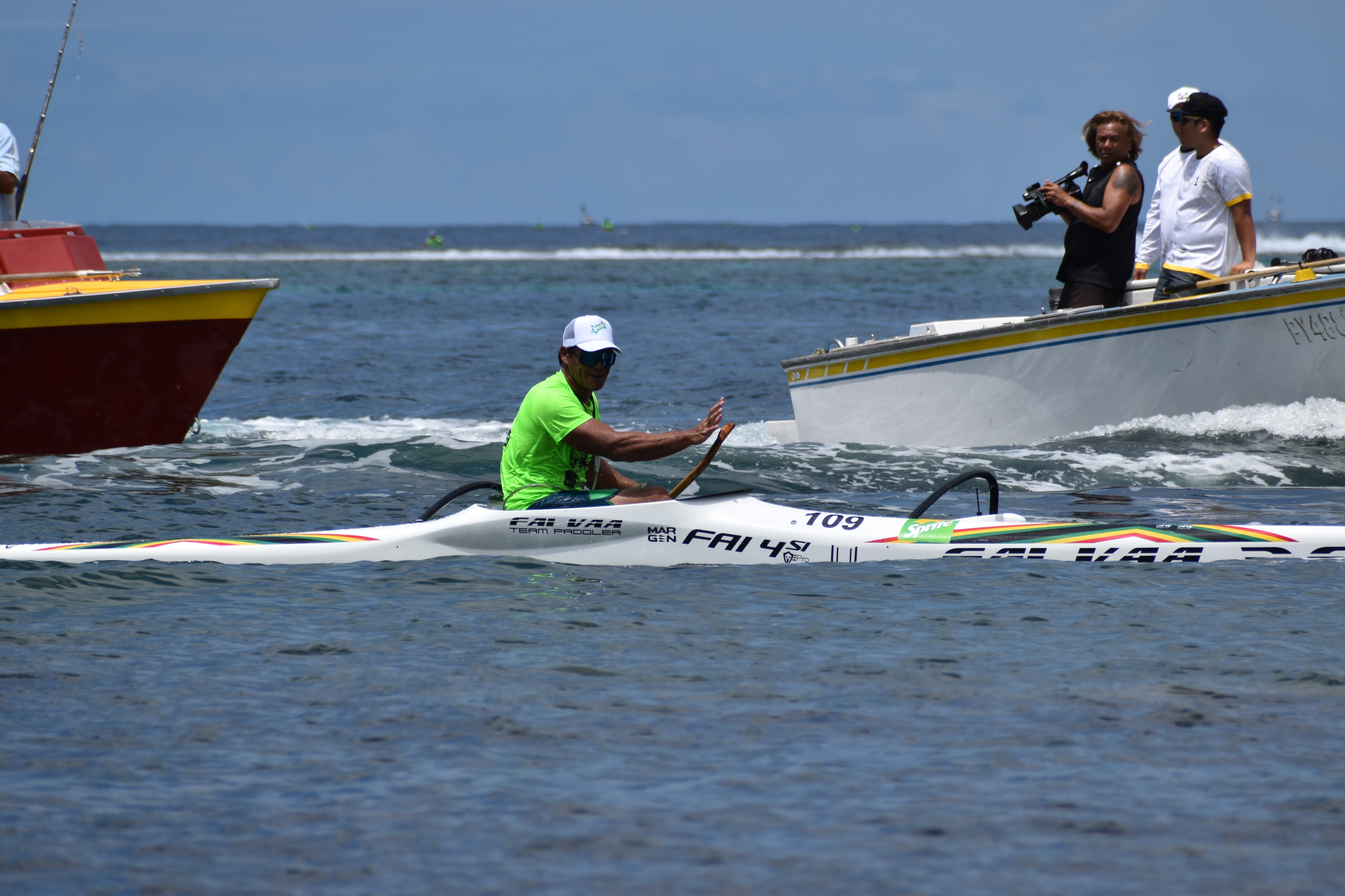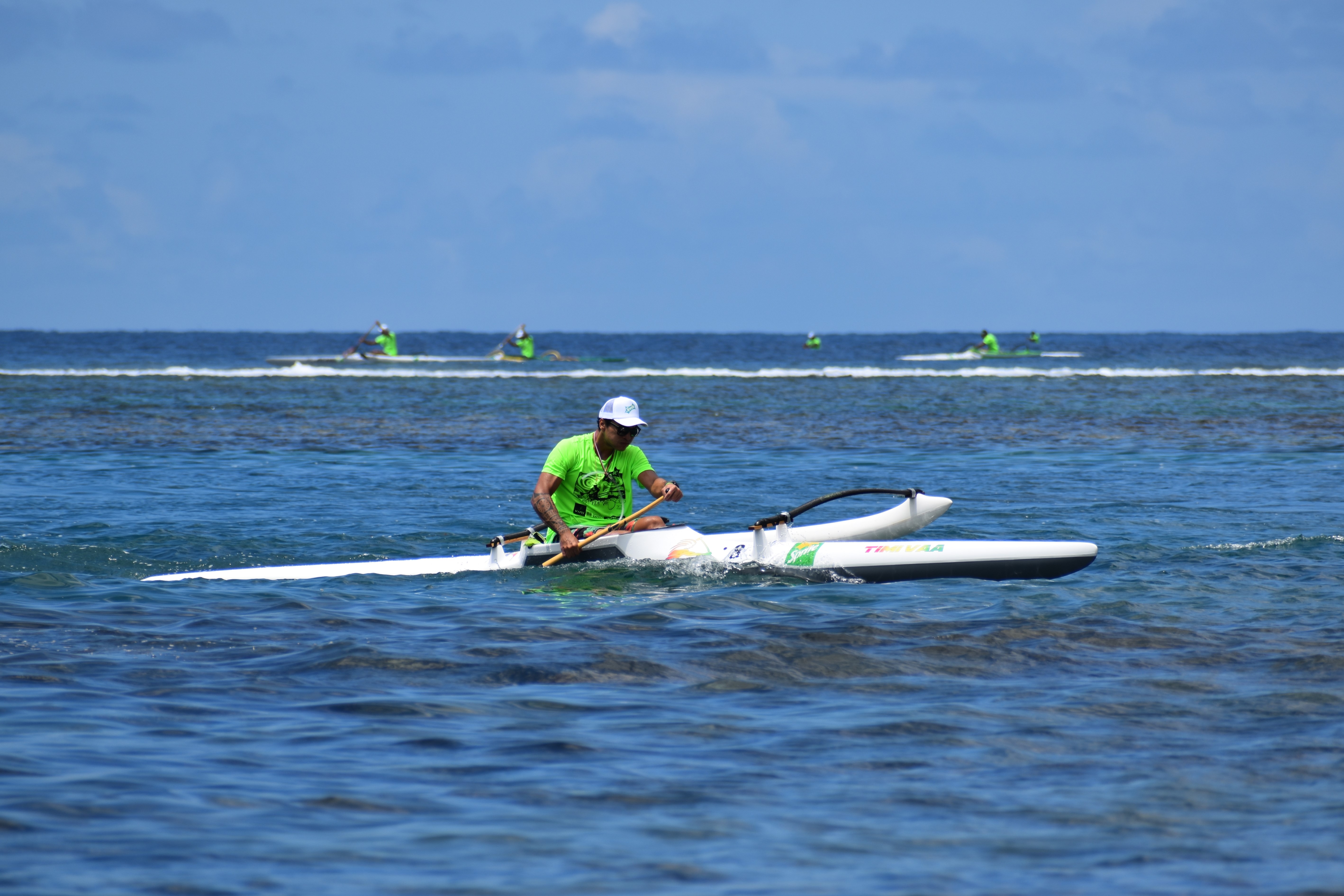 Comme annoncé, les premiers coups de rame ont été donnés à 10 heures tapantes, sous un grand soleil et une chaleur écrasante. Cap sur Hitia’a avec 22 km à parcourir en présence d’une quinzaine de bateaux suiveurs. Peu avant midi, Kyle Taraufau a été le premier à franchir la ligne d’arrivée, devant la marina. “J’avais pour objectif d’aller le plus droit possible sur Hitia’a. J’ai cru en mon cap, et je crois que c’est ce qui a fait la différence en restant à gauche pour éviter le courant qui sortait de la passe à l’arrivée, quand tout le monde était plutôt à droite. Je suis resté confiant : c’est de bon augure pour la suite ! On va essayer de rester sur cette lancée”, nous a-t-il confié, déterminé à faire mieux que l’an dernier, où il avait terminé sixième au classement général.