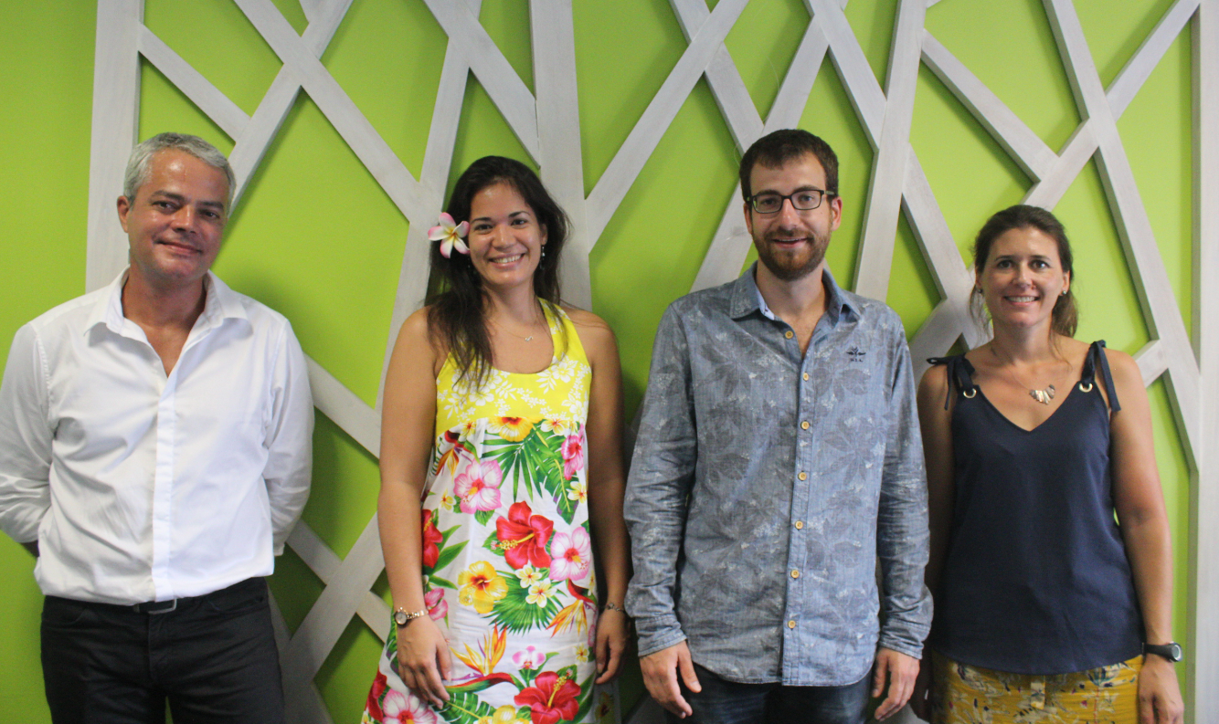 De gauche à droite, Mathias Mercier, représentant de l'Ademe en Polynésie française, Orama Richaud de la CCISM, Simon Dely, de l'entreprise ECO2 Initiatives et Sandrine Ouiazem, chargée de mission Energie à l'Ademe.
