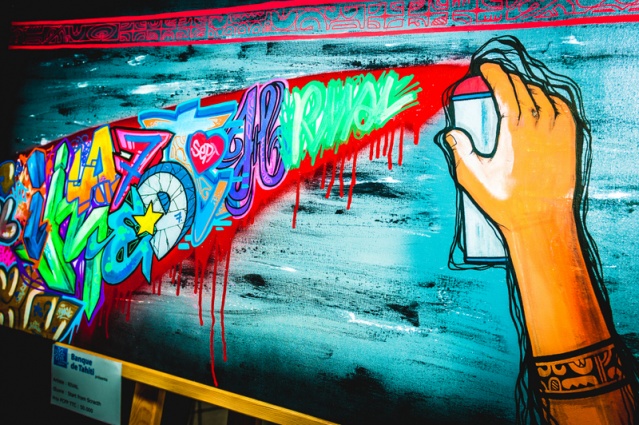 L’EXPO 7,Premier événement institutionnel culturel 2014 de la Banque de Tahiti mettant en avant la culture locale et les artistes qui ont su par leurs œuvres faire découvrir leur vision du monde, de la Polynésie, d’un certain état d’être. La culture qu’elle que soit sa forme ! C’est l’art Graffiti pour cette année qui a pris place au siège de la Banque de Tahiti, rue Cardella à Papeete, dans son hall d’accueil. 7 artistes à découvrir, partenaires de l’événement: