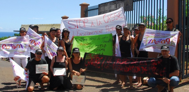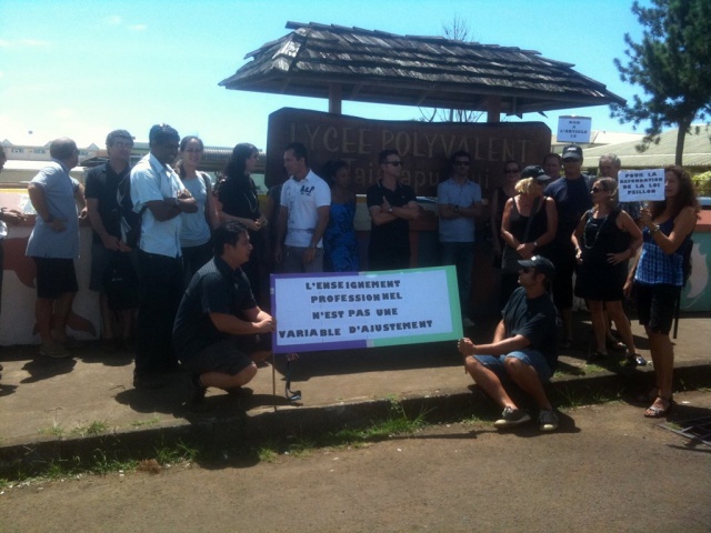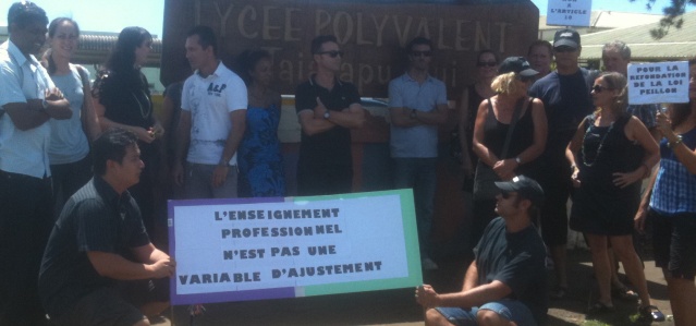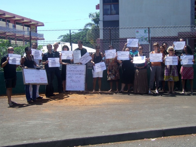 C‘est ainsi que tous vêtus de noir, les enseignants se sont réunis devant les établissements du lycée Hôtelier de Tahiti, des lycées professionnels d’Uturoa, de Faa’a et de Mahina, des lycées polyvalents d’Aorai, de Papara, de Taravao et Taaone et dans les différents Cetad et Segpa pour se faire entendre.