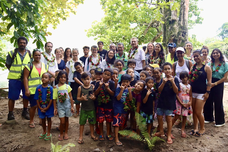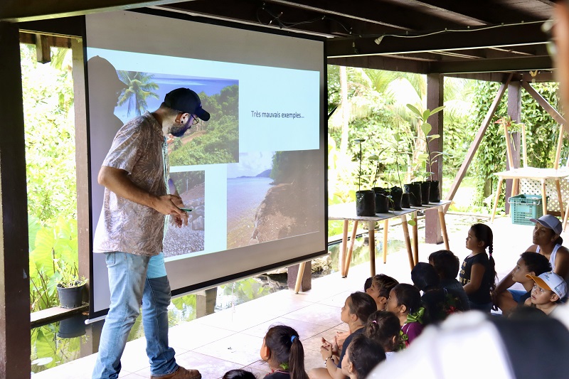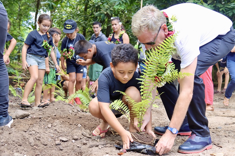 Lors de sa visite, le haut-commissaire a assisté à une action de sensibilisation organisée dans le cadre du projet. Des élèves de CP de l’école de Papetoai ont visité une pépinière de plantes indigènes et ont participé à une plantation symbolique aux côtés des autorités présentes.