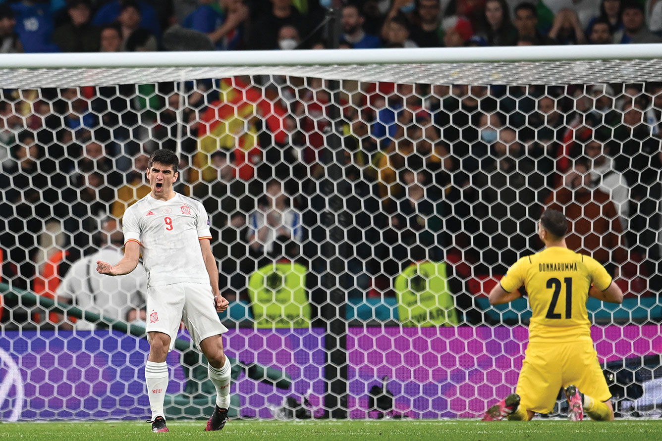 D'un une-deux plein axe, Morata a fixé le capitaine italien, servi en relais Dani Olmo puis pris de vitesse Chiellini pour gagner son face à face avec Gianluigi Donnarumma.