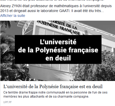 Dimanche matin, l'université a rendu hommage à deux de ces plongeurs, Alexey Zykin et son épouse, Tatyana Makarova. "Alexey Zykin était professeur de mathématiques à l’université depuis 2013 et dirigeait aussi le laboratoire GAATI (acronyme de Géométrie Algébrique et Applications à la Théorie de l'Information). Il avait été élu très récemment membre du nouveau conseil d’administration de l’UPF", indique l'université. "Nous avons eu l'honneur de connaître Alexey, en tant que collègue, c’était un brillant mathématicien. Il était aussi une personne humainement très appréciée car toujours souriant, accueillant et amical envers tous. Sa compagne Tatyana, fut une excellente étudiante en master management, puis une doctorante très prometteuse au sein du laboratoire GDI (Gouvernance et Développement Insulaire)"