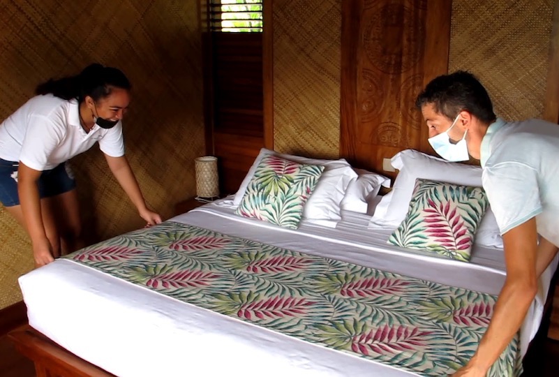 “Ce partenariat conclu avec ces deux établissements touristiques de l’île, explique Grégory Bru, le professeur de biotechnologie, santé et environnement, permet aux élèves de voir comment fonctionne un hôtel et plus précisément la partie hébergement. C’est-à-dire qu’ils travaillent sur la préparation des bungalows ou des chambres, la gestion du linge de lit et de toilette, puis ils sont en contact avec les professionnels du métier. D’autre part, ce partenariat est très intéressant car les élèves ont affaire à deux hébergements très différents puisque nous avons d’une part un établissement 4 étoiles membre de Relais et Châteaux, Le Nuku Hiva, et d’autre part, une pension de famille, le He’e Tai inn, donc deux modes de fonctionnement totalement différents.”