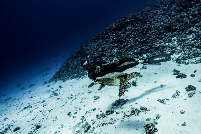 Devant chez lui, Guillaume Néry peut rapidement sortir du lagon, tutoyer les profondeurs et rencontrer des tortues comme sur cette photo. Photo : DR